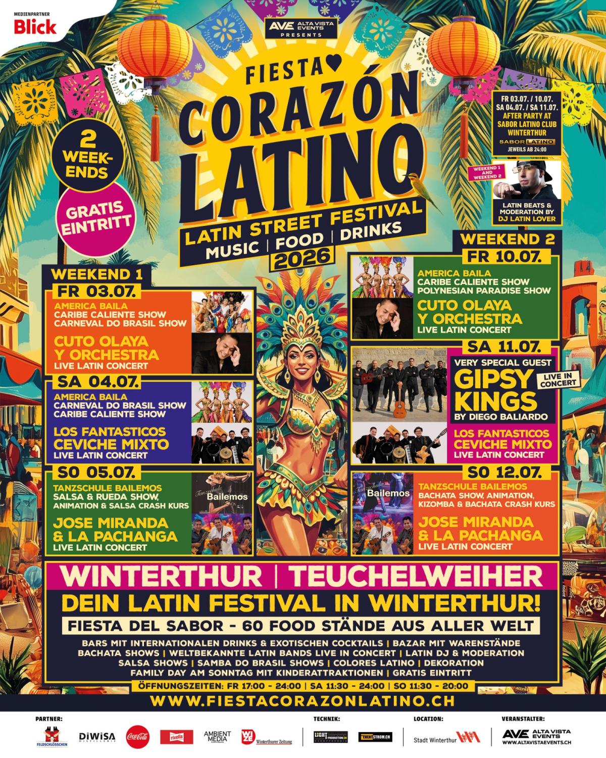 Tauche ein in die Welt Lateinamerikas – voller Musik, Tanz, Farben und kulinarischer Vielfalt. Das Fiesta Corazón Latino bringt echtes Latin-Feeling direkt ins Herz von Winterthur. Freu dich auf zwei Wochenenden mit Shows, Live-Konzerten, Marktständen sowie einer grossen Auswahl an Street Food und exotischen Drinks – direkt am Teuchelweiher.